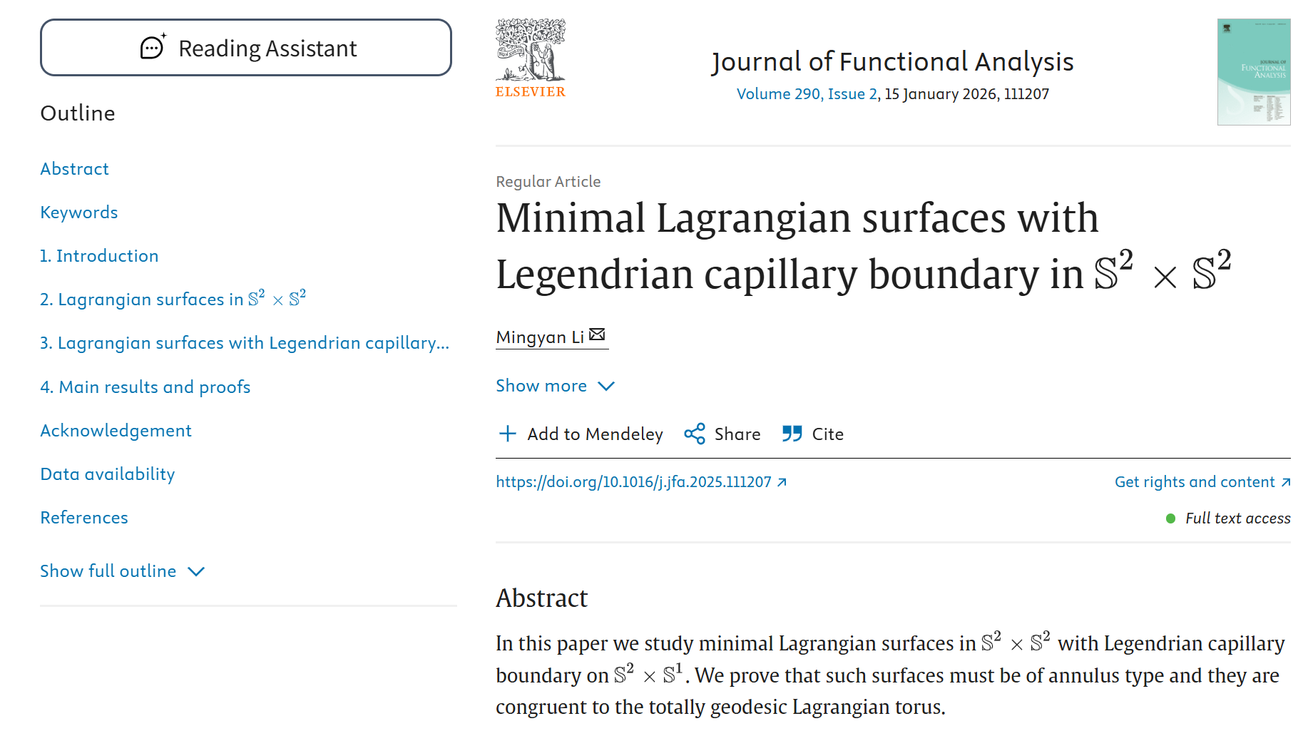 中国海洋大学数学科学学院李明艳副教授在国际基础数学领域期刊《Journal of Functional Analysis》上发表了题为“Minimal Lagrangian surfaces with Legendrian capillary boundary in S^2×S^2”的研究论文。