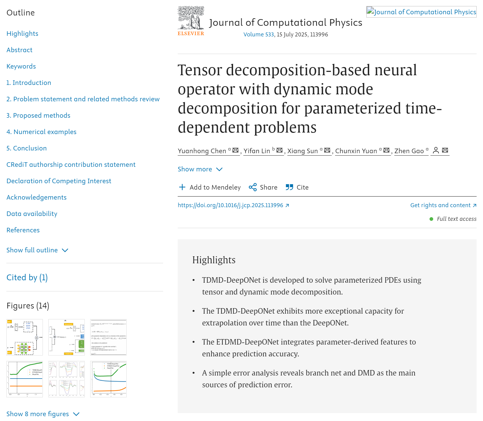 中国海洋大学数学科学学院高振教授及其合作者在国际计算数学领域TOP期刊《Journal of Computational Physics》上发表了题为“Tensor decomposition-basedneural operator with dynamicmode decomposition forparameterized time-dependentproblems”的研究论文。