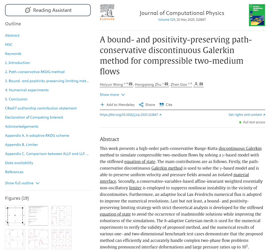 中国海洋大学数学科学学院高振教授及其合作者在国际计算数学领域TOP期刊《Journal of Computational Physics》上发表了题为“A bound- and positivity-preserving path-conservative discontinuous Galerkin method for compressible two-medium flows”的研究论文。